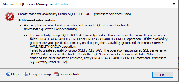 The availability group ‘SQLTSTCLS_AG’ already exists. This error could be caused by a previous failed CREATE AVAILABILITY GROUP or DROP AVAILABILITY GROUP operation. If the availability group name you specified is correct, try dropping the availability group and then retry CREATE AVAILABILITY GROUP operation.