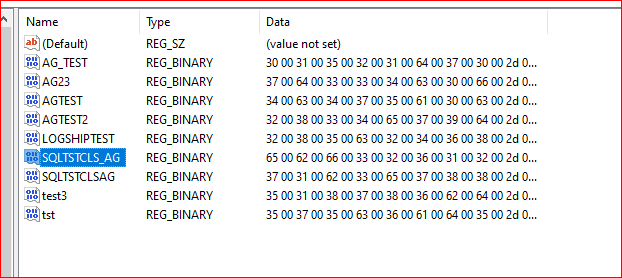 Regedit üzerinden ilgili bölüme geldikten sonra oluşturmak istediğimiz SQLTSTCLS_AG isminin olduğu görülmektedir.