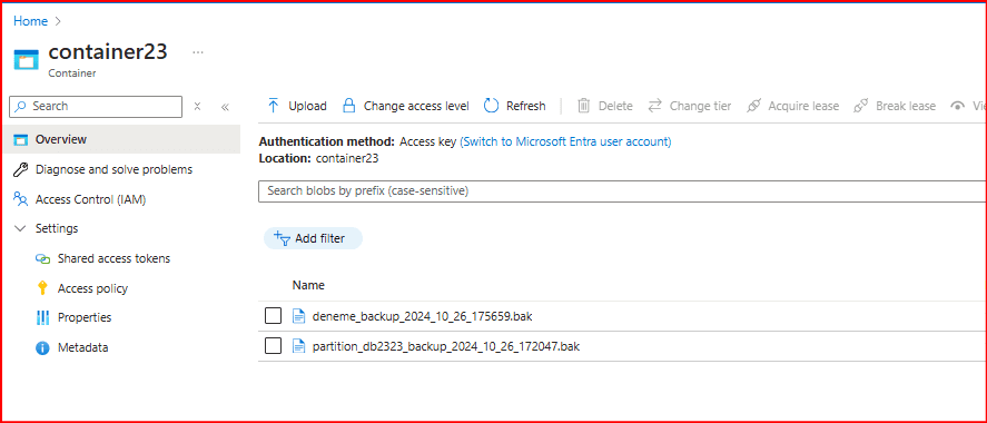 OK dedikten sonra Azure Portalında backupları almış olduğumuz Container klasörüne bağlanmış oluruz.