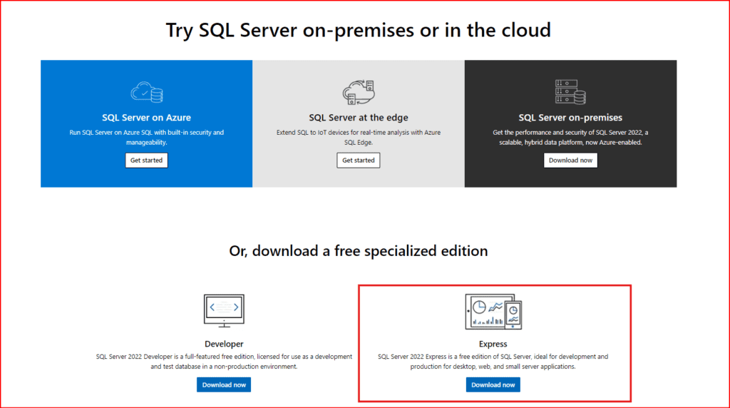 Microsoft’un sayfasından Sql Server 2022 Express Edition indirebilirsiniz.