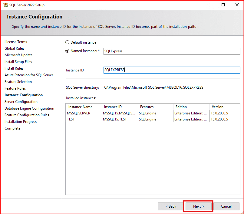 Gelen  ekranda önümüze instance ‘ın default instance adımı yoksa bizim belirlediğimiz özel bir instance adımı olması gerektiğini söylüyor biz burada named instance seçeneğini seçerek işlemlerimizi yapacağız. Installed instances kısmında ise makinamız üzerinde kurulu olan diğer sql instanceları görmekteyiz. SQLExpress olarak ismimizi belirledikten sonra Next deyip bir sonraki aşamaya geçiyoruz.
