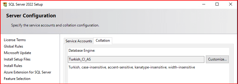 Bu ekranda herhangi bir değişiklik yapmadan Services Accounts’ın yanından bulunan Collation kısmına geliyoruz bu yapı sql server’ın hangi dil yapısına göre sıralanacağını belirtiyoruz.