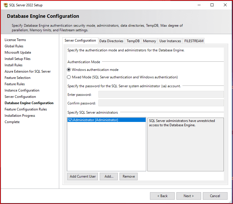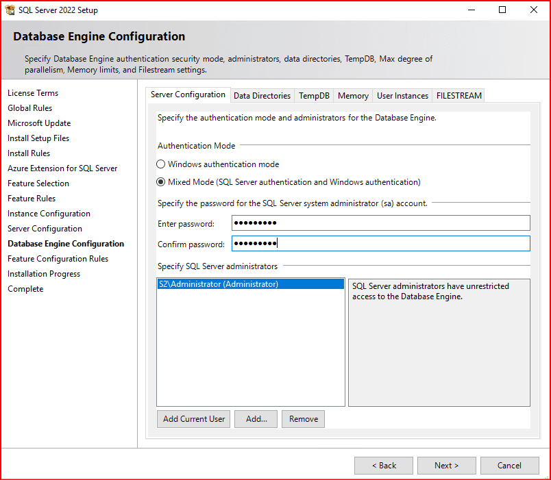 Hem Windows Authentication  modda hem de sql  Authentication  modunda girmesini istiyorsak mixed modu seçmemiz gerekiyor. Ben kuracağım sql server Windows Authentication  modundan hemen bağlanmak için S2 sunucumun şifresini girerek sql server map ediyorum. Mixed modda belirlediğimiz şifre kurulacak instance’daki sa şifresi. Bunu yapmazsak sql server’a SSMS üzerinden sa ve şifresiyle giriş yapamayız. Bu ekranda add current user bölümünde active directory’deki oluşturduğumuz bir kullanıcıyı veya S2 sunucusunda oluşturduğumuz local bir kullanıcıyıda Windows modunda girmesi için ekleyebiliriz.