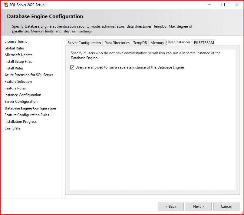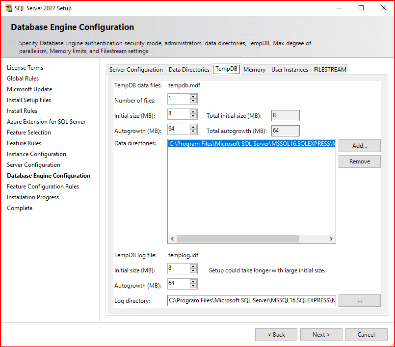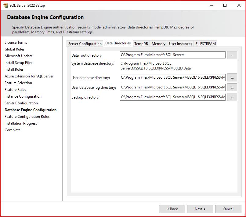 Bir sonraki ekranda Server Configuration, Data Directories, TempDB, Memory, User Instance ve FILESTREAM bölümlerini görmekteyiz.