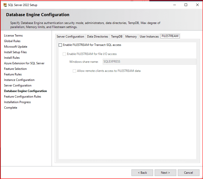 Memory, User Instance, FILESTREAM tabında herhangi bir işlem yapmayıp next deyip bir sonraki adıma geçiyoruz.