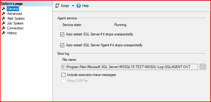 Yukarıdaki resimde SQL Server Agent’ın Advanced sekmesini gösteriyor. Bu sekmede SQL Server Agent’ın olay yönlendirmesi ve işlemci kullanım durumu gibi gelişmiş ayarlarını yapılandırabilirsiniz.