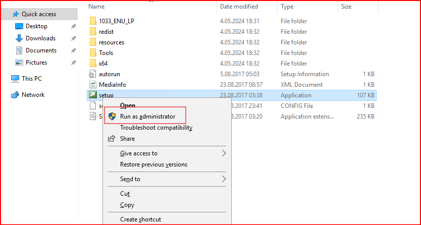 Sunucumun içerisine kopyalamış olduğum sql server’ı açıyorum setup dosyasına sağ tıklayıp yönetici olarak çalıştırıyorum.(13. Madde)