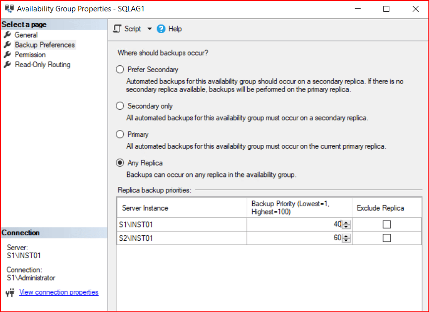 Aşağıdaki bulunan AlwaysOn properties bölümünde S2\INST01sunucumu backup için öncelikli hale getirmiş oldum.