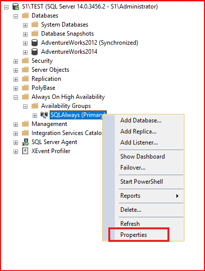 Ok deyip bu değişikliği yaptıktan sonra tekrardan AlwaysOn AG’mizin üzerine gelip sağ tıklayıp properties ekranını açıyoruz.