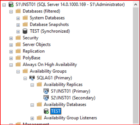 S3 sunucusunda veritabanını eklemiş olduk. Veritabanı S1sunucusunda ilgili AG altından çıkarılır. Son kullanıcılar S1 sunucusu üzerinde ilgili veritabana erişmektedir. Test veritabanının farklı bir AG altına eklenmesi son kullanıcısının S1 sunucusu üzerinden erişmesine engel değildir. Yeni oluşturulan AG yapımızın listener’ı farklı olsa bile son kullanıcı primary olan sunucuda veritabanını okumaktadır.