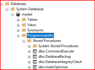 Bu makalede AlwaysOn yapısında bulunan tüm dblerin Availabilty Group bazında backup alma işlemini ele alacağım. Ola.hallengren.com sayfasında bulunan MaintenanceSolution.sql scriptinin çalıştırılması lazım. Bu script çalıştırıldıktan sonra master veritabanı altında Programmability altında bulunan Stored Procedures bölümünde ilgili stored procedure’lerin geldiğini görebiliriz.