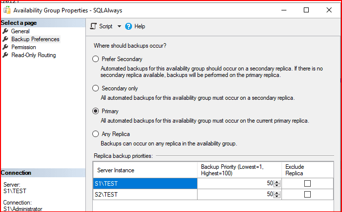 AlwaysOn ekranında Backup Preferences kısmından Primary sunucusundan backup alma yöntemi olan seçeneği seçiyoruz.