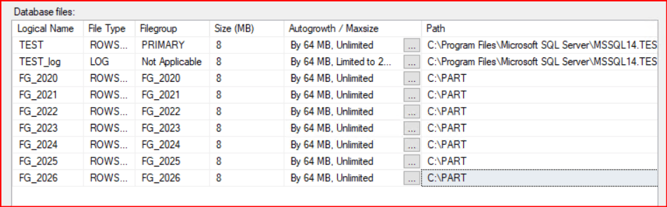 ALTER DATABASE [TEST] ADD FILE ( NAME = N'FG_2026', FILENAME = N'C:\PART\FG_2026.ndf' , SIZE = 8192KB , FILEGROWTH = 65536KB ) TO FILEGROUP [FG_2026]