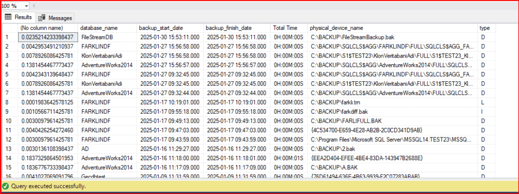 İlgili komutu çalıştırdığımızda backup history yapımızın güncellendiğini görmüş oluyoruz. Yukarıdaki komutu bir job ile belirli aralıklarla çalıştırabiliriz.