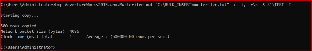 bcp AdventureWorks2015.dbo.Musteriler out "C:\BULK_INSERT\musteriler.txt" -c -t, -r\n -S S1\TEST -T