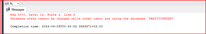 Database state cannot be changed while other users are using the database ‘PARTITIONTEST’