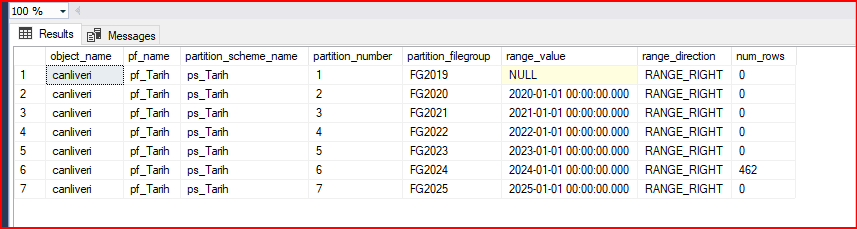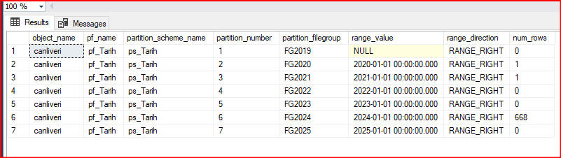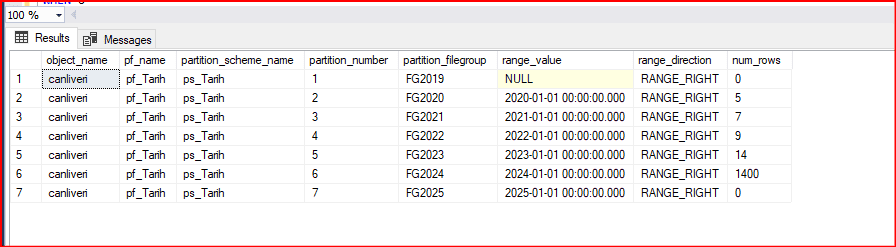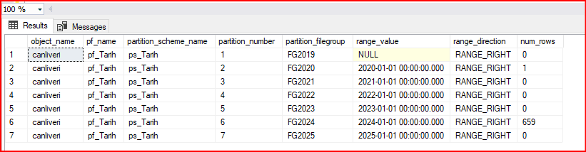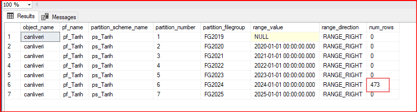 Bu komut partition’lı olan FG’leri görmekteyiz son yılın verisi ilgili file froup’a canlı bir şekilde akmaktadır.