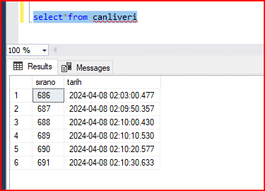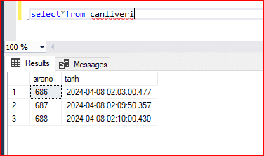 Yukarıdaki kodda [dbo]].[canliveri_eski] tablosundaki son değeri canlıveri23 tablosuna atmıştım önceden sırano 686 olan değeri.