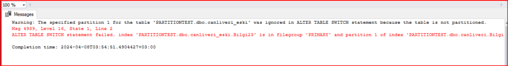 ALTER TABLE SWITCH statement failed. index ‘PARTITIONTEST.dbo.canliveri_eski.Bilgi23’ is in filegroup ‘PRIMARY’ and partition 1 of index ‘PARTITIONTEST.dbo.canliveri.Bilgi23’ is in filegroup ‘FG2019’.