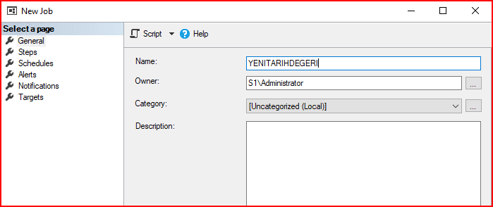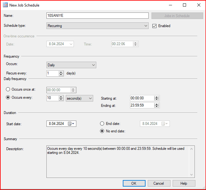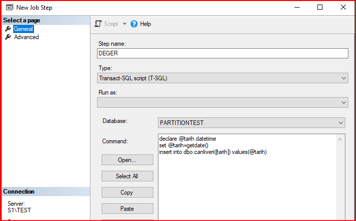 Sıra sıra yıllara göre sanki kullanıcı bazlı işlem yapılmış gibi tarihe göre sıralı bir şekilde veri attım. Zaten sıralı atmasamda nonclustered onu kendi içinde diziyor. Manuel yaptığım işlemlerden sonra bunu bir job’a bağlayıp sanki bir canlı sistemmiş ve kullanıcılar’dan sürekli veri geliyormuş gibi senaryomu oluşturdum. Aşağıda job tanımlama adımlarım