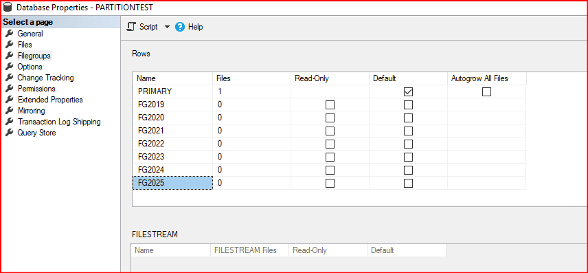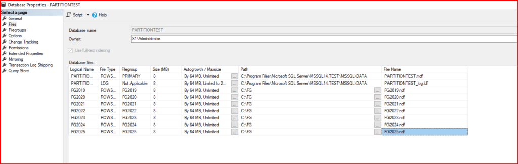 ALTER DATABASE [PARTITIONTEST] ADD FILE ( NAME = N'FG2025', FILENAME = N'C:\FG\FG2025.ndf' , SIZE = 8192KB , FILEGROWTH = 65536KB ) TO FILEGROUP