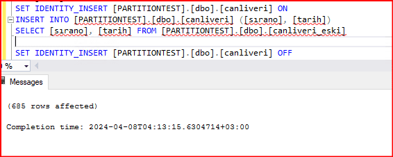 Eski tablomuzdan yeni partition tablomuza aşağıdaki komutla partition switch işlemi yapılmaya çalışılır. Bu komut canlıveri_eski tablosunda 1 numaralı partition işlemini canlıveri tablosunda aynı numaralı partition’a taşımak ister