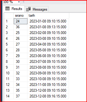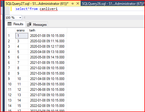 Şimdi oluşturmuş olduğum bu canlıveri tablosuna 82 tane manuel tarih insert ettim ilk başta manuel veriler atalım daha sonra bir job tanımlayarak canlı veriler atmaya başlayalım. 2020 yılından başlayarak atmaya başladım. Resimde görüldüğü gibi