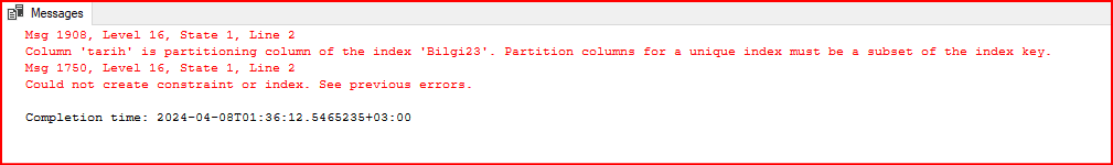 Bu şekilde bir hata aldım. Bunun sebebi partition scheme’mız FG üzerine tanımlı ama tarih function’nıyla ilişkili unique indexs’in içinde tarih kolunun tanımlamazsam hata alırım. Bunu partition’lı tüm tablolarımızda hangi index türü unique indexse bu yapıda oluşturursak yapmamız lazım. Bu yapı hakkında detaylı bilgi almak istiyorsanız ilgili makale okunabilir.