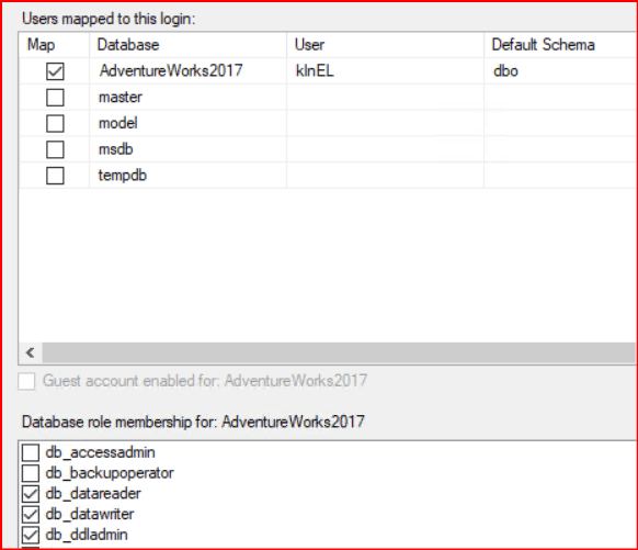 İlgili kullanıcının veritabanı üzerinde aşağıdaki yetkileri bulunmaktadır.