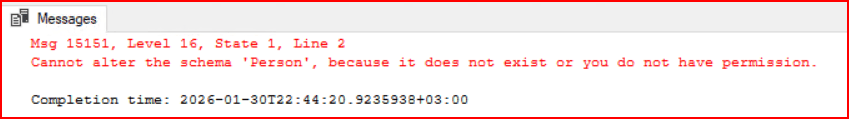 Cannot alter the schema ‘SchemaName’, because it does not exist or you do not have permission.