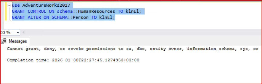 GRANT CONTROL ON schema::HumanResources TO klnEl;