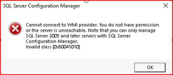 Cannot connect to WMI provider. You do not have permission or the server is unreachable. Note that you can only manage SQL Server 2005 and later servers with SQL Server Configuration Manager. Invalid class [0x80041010]