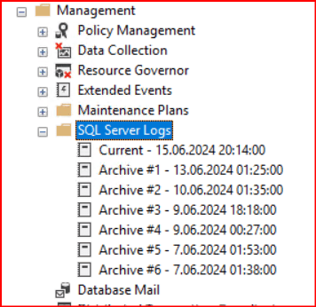 Restart yaptıktan sonra aşağıdaki resimde dikkat ederseniz önceki ekran resmini almış olduğum SQL Server Logs altında bulunan  Archive #6-7.06.2024 01:38:00 arşiv klasörünün kaybolduğunu gözlemlemiş oldum. Yeni error log dosyasında current ise sistemin restart veya recycle edildiği tarih görülmektedir. Sistem ne zaman restart olmuş, kapanmış, açılmış veya recycle  edilmiş aşağıda current’ın yanındaki  tarihten gözlemleyebiliriz. Bu değer error log dosyası açıldığı zaman açıldığı zaman dilimi set edilmektedir.