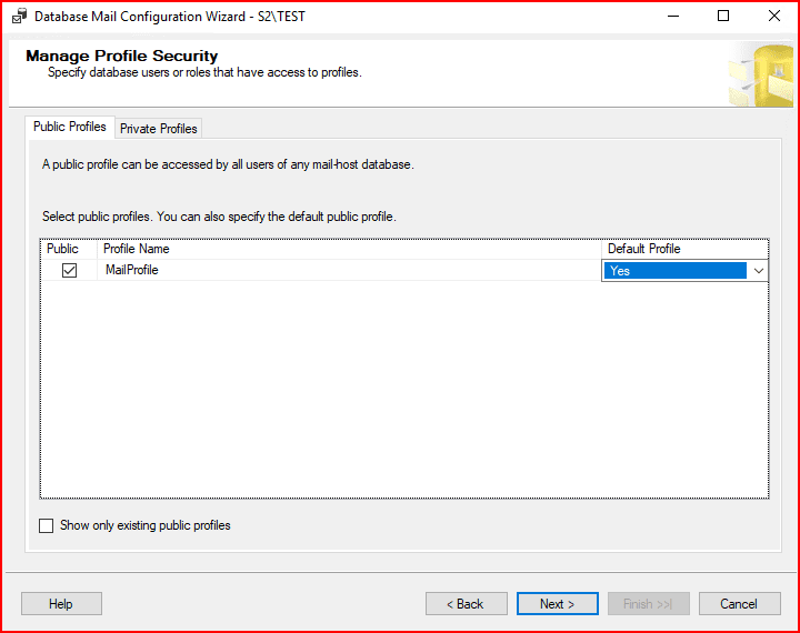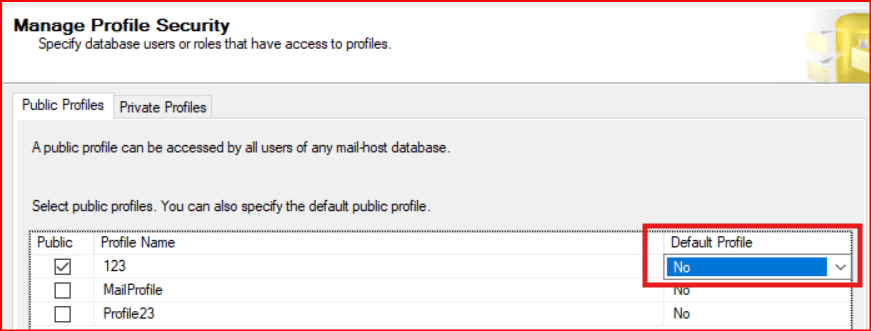 Not: No global profile is configured. Specify a profile name in the @profile_name parameter. şeklinde hata ile karşılaşıyorsak bu Default profil yapısının No olarak seçilmesinden dolayıdır.