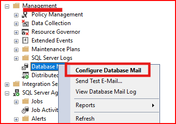 SSMS üzerinde Management sekmesi altında Database Mail’e sağ tıklayarak Configure Database Mail’a tıklıyoruz.