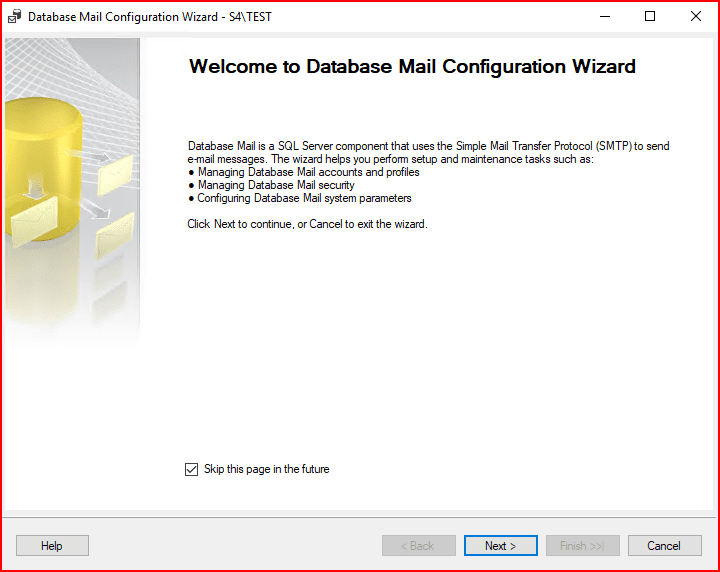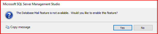 Makalenin başında belirtmiştim sp_configure‘den Database Mail etkinleştirilmemişse, aşağıdaki ekranı göreceksiniz. Etkinleştirmek için Yes‘e tıklamanız yeterli. Zaten etkinleştirilmişse, bu ekran görünmeyecektir.