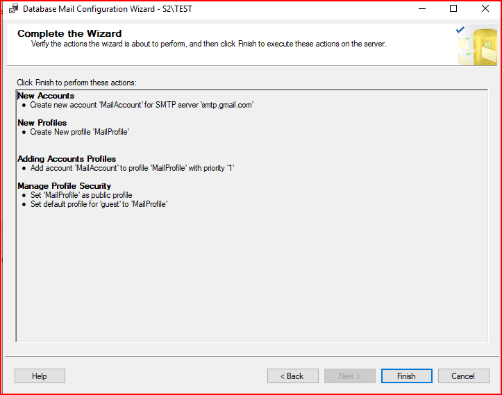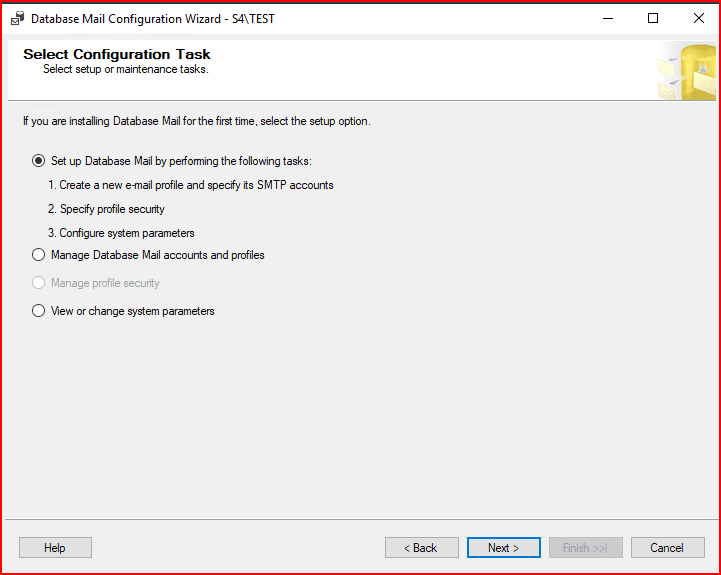 1.Set up Database Mail by performing the following tasks: Bu seçenek, Database Mail’i ilk kez kurmak için kullanılır. Üç adımı içerir: Yeni bir e-posta profili oluşturmak ve SMTP hesaplarını belirtmek. Profil güvenliğini belirlemek. Sistem parametrelerini yapılandırmak.