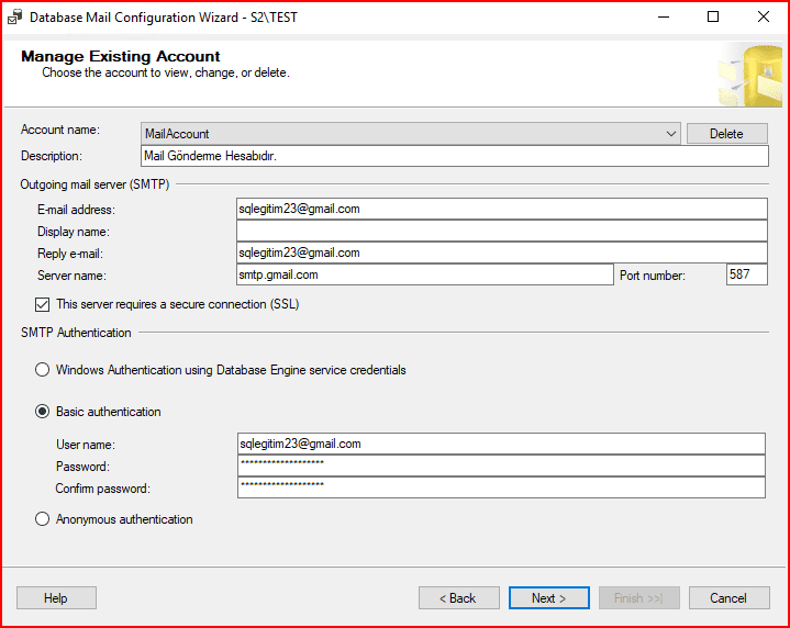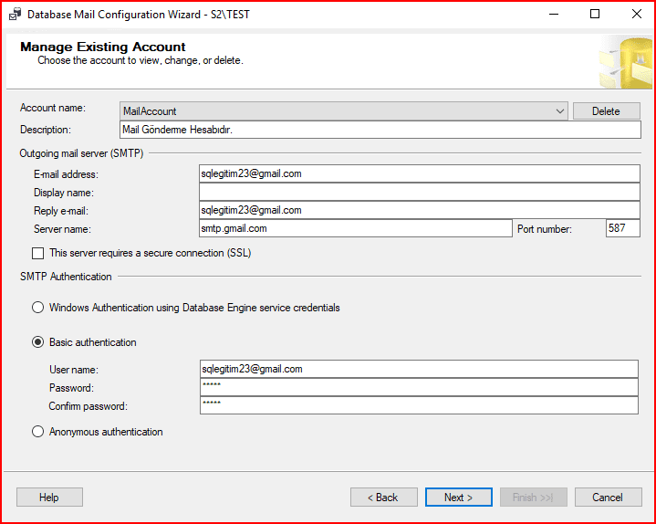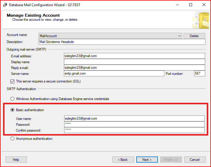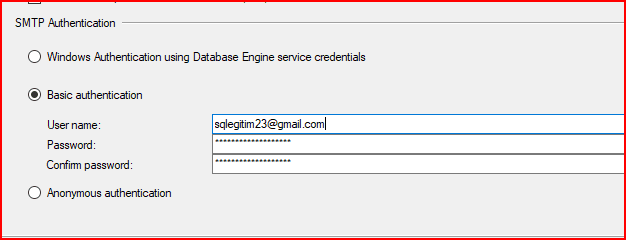 Windows Authentication using Database Engine service credentials: SQL Server’ın kendi hizmet kimlik bilgilerini kullanarak kimlik doğrulama database mail yaptığımız local kullanıcı.