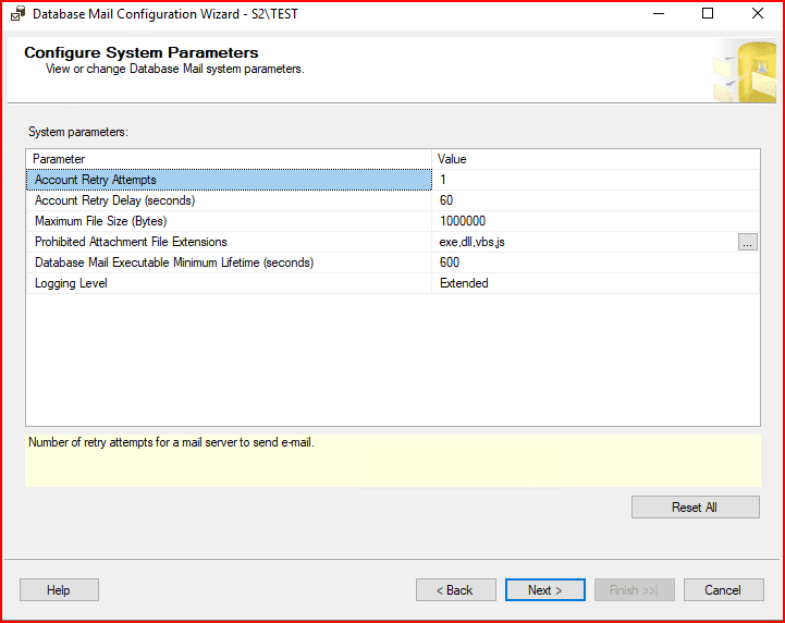 Account Retry Attempts: Bu parametre, SQL Server’ın bir e-posta gönderme işlemi başarısız olduğunda kaç defa yeniden deneyeceğini belirtir. Ekranda bu sayı “1” olarak ayarlanmış, yani başarısız e-posta gönderimi için yalnızca bir kez daha deneme yapılacaktır.
