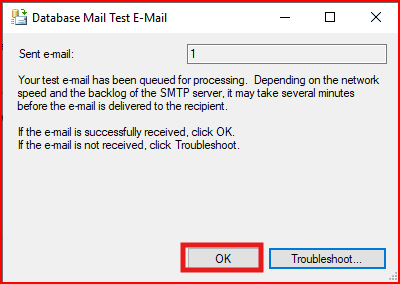 Yukarıdaki yapılanmadan sonra Send test e-mail diyerek test mailimizi yolluyoruz. Aşağıdaki ekranda başarılı ise Ok butonuna basabiliriz. İşlemimiz başarısız ise Troubleshoot.. kısmına tıklanıp çözüm yollarına bakabiliriz.