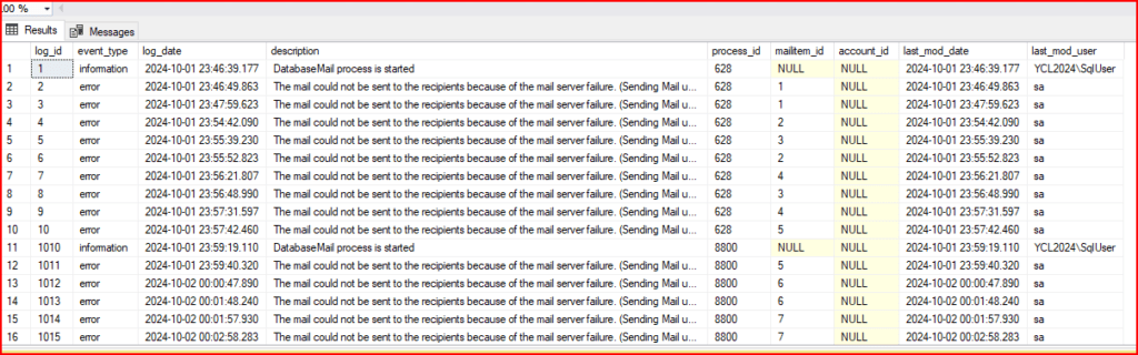 Msdb veritabanının altında aşağıdaki komutu çalıştırırsak mail log kayıtlarıyla ilgili bilgi dönmektedir.