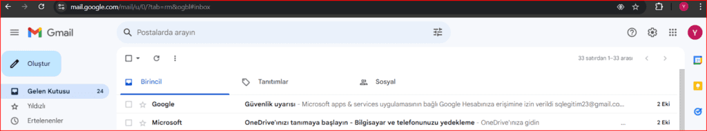 Aşağıdaki resimde de görüldüğü gibi farklı profil altında oluşturulmuş farklı kullanıcı ile sqlegitim23’e mail göndermiş olduk.