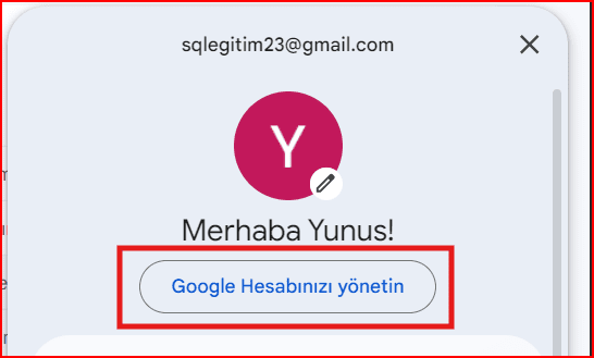 Daha sonra hesabımızın olduğu kısımda Google Hesabınızı yönetin seçeneğine tıklanır.