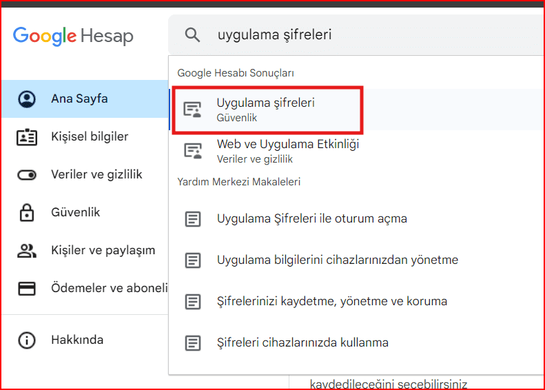 Google hesabımızda Uygulama şifreleri yazılır. İngilizce kullanıyorsanız App password yazılması gerekmektedir.