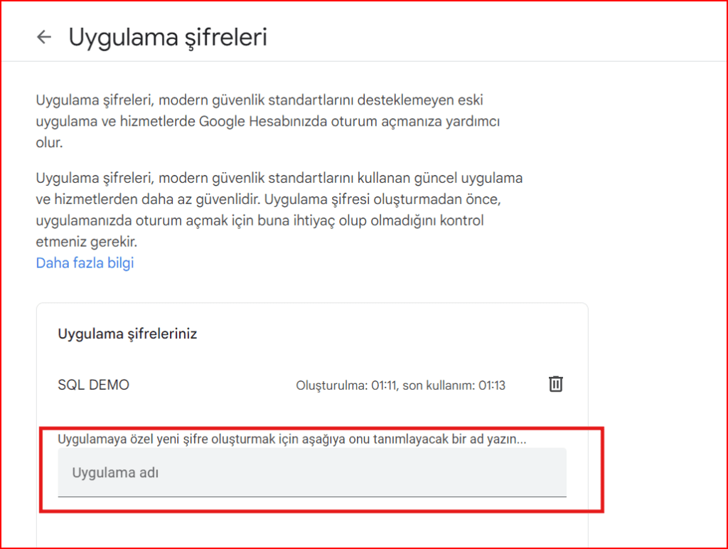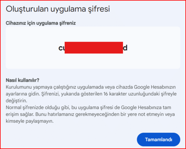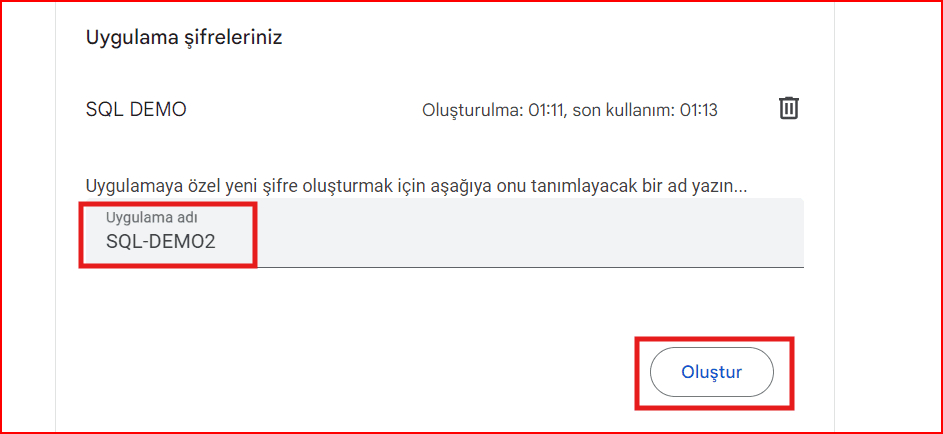 Uygulama adını kendi yapımıza uygun bir şekilde belirledikten sonra oluştur seçeneği ile uygulama bazlı bir şifre almış olacağız. Uygulama adı bölümü rastgele bir şeyde yazılabilir.