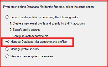 2. Manage Database Mail accounts and profiles: Bu seçenek, daha önce oluşturulmuş e-posta profillerini ve hesaplarını yönetmenize olanak tanır. Sonradan değişiklikleri bu kısımdan yaparız.