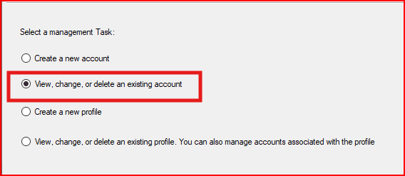 Gelen ekranda View,change,or delete an existing account kısmına tıklanır.