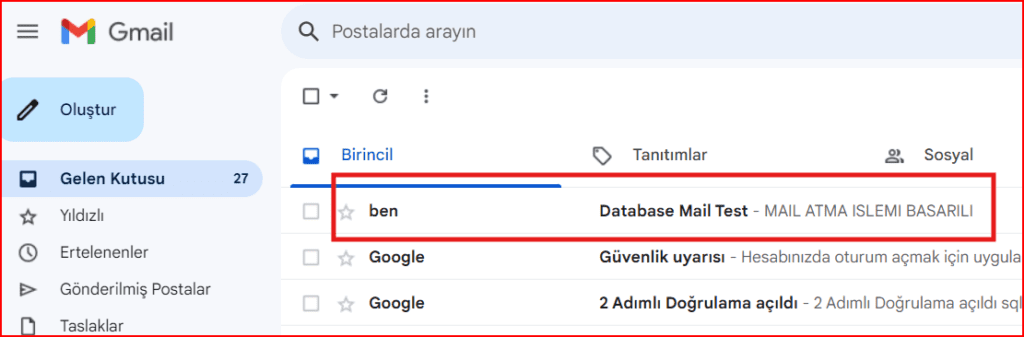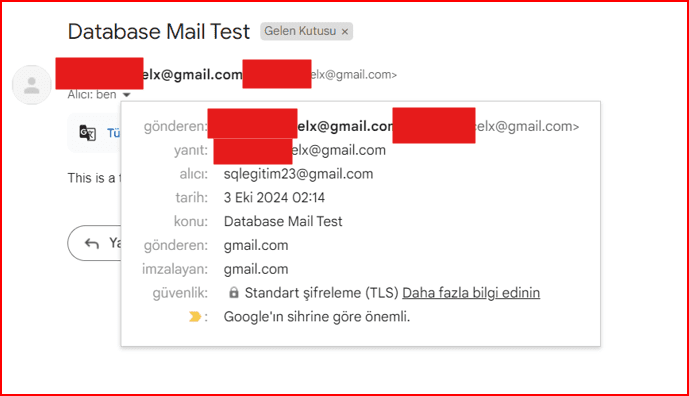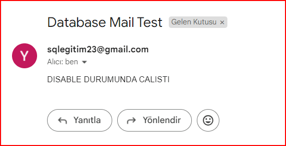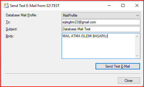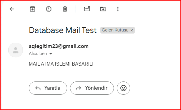 Dikkat ederseniz gönderici adresi bizim Mail profilde tanımladığımız adres tüm maillerde başka bir profil seçilmediği durumda gönderen sqlegitim23 olacaktır. Yukarıdaki örnektede kendimize mail göndermiş olduk.