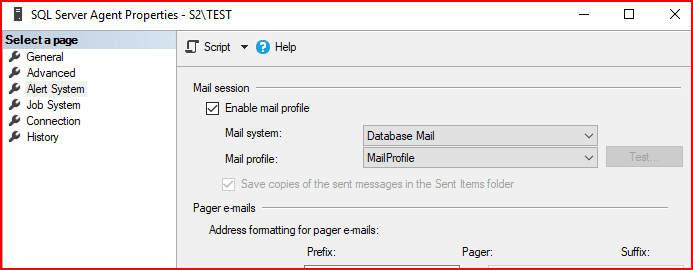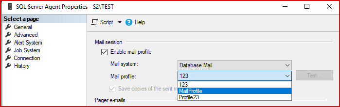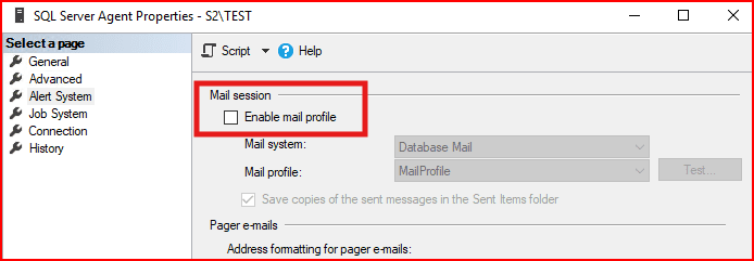 Mail konfigürasyonumuzun tam kurulumunu yukarıda yapmış olduk. Operator’un alert veya sql bazında herhangi bir işlemden haberdar olabilmesi için SQL Agent altında düzenleme yapılması gerekmektedir. Bu işlem için SQL Server Agent sağ tıklanıp Properties kısmına gelelim. Alert System üzerine gelerek oluşturduğumuz Enable mail profile durumunu aktif hale getirelim ve hangi profil üzerinden işlemlerimizi gerçekleştireceğimiz seçelim.