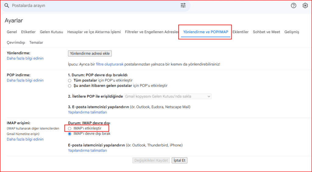 Görmeniz açısından paylaşıyorum. Yukarıdaki resimdeki Tüm ayarları görüntüleyin bölümüne girilir. Gelen ekranda Yönledirme ve POP/IMAP’ı etkileştirin kısmı işaretlenir. Bende görmüş olduğunuz gibi kapalı bir sıkıntı yaşamadım.